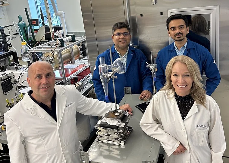 Clockwise from front left: Cirrito, Chakrabarty, Puthussery and Yuede stand alongside the SARS-CoV-2 wet cyclone aerosol sampler they developed. Photo: Shubham Sharma