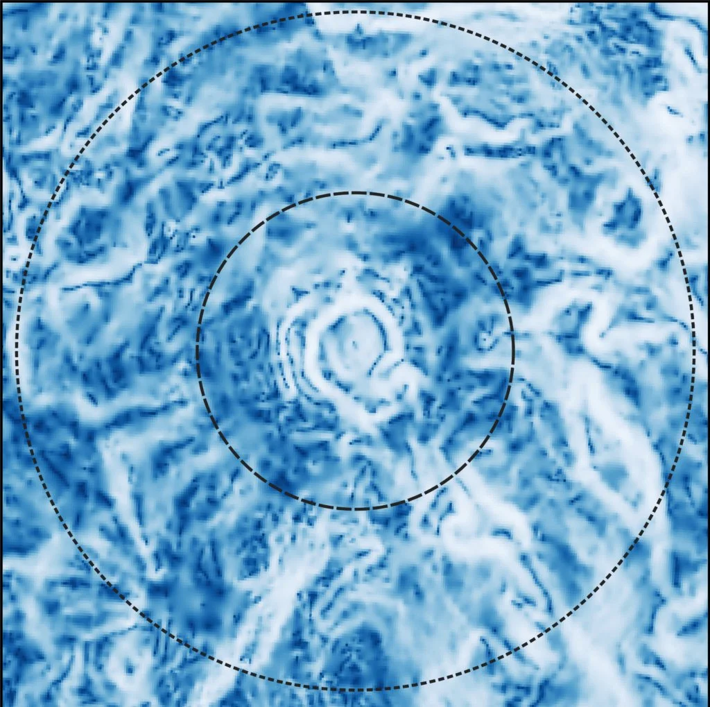 The gravity slope around the crater’s center shows a slight bullseye pattern, but farther out, the signal is lost to time. Credit: Huber et al. (2023), JGR Planets