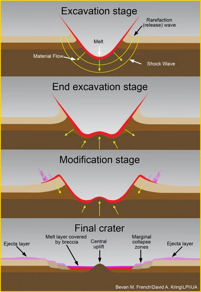 The impactor hit with such energy that the crust and mantle rose up where the impact occurred, leaving a long-term dome. Farther from the center, ridges of rock jutted up, minerals transformed and rock melted. And then time took its course, eroding about 10 kilometers (6.2 miles) down from the surface in two billion years.