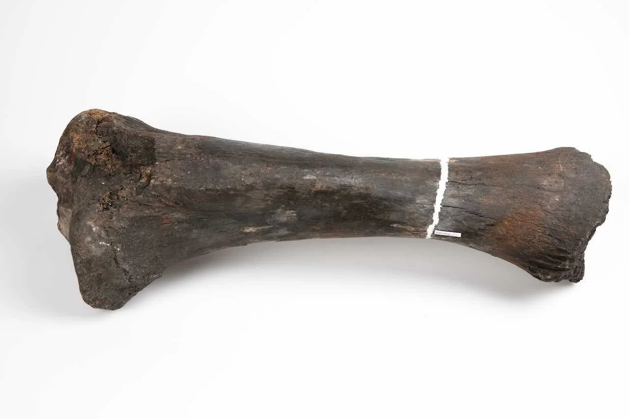 Tibia de mastodonte de Little Narrows, con una antigüedad estimada de 358.000 años, probablemente el ejemplar más antiguo con datos genéticos disponibles. Cortesía: Nova Scotia Museum