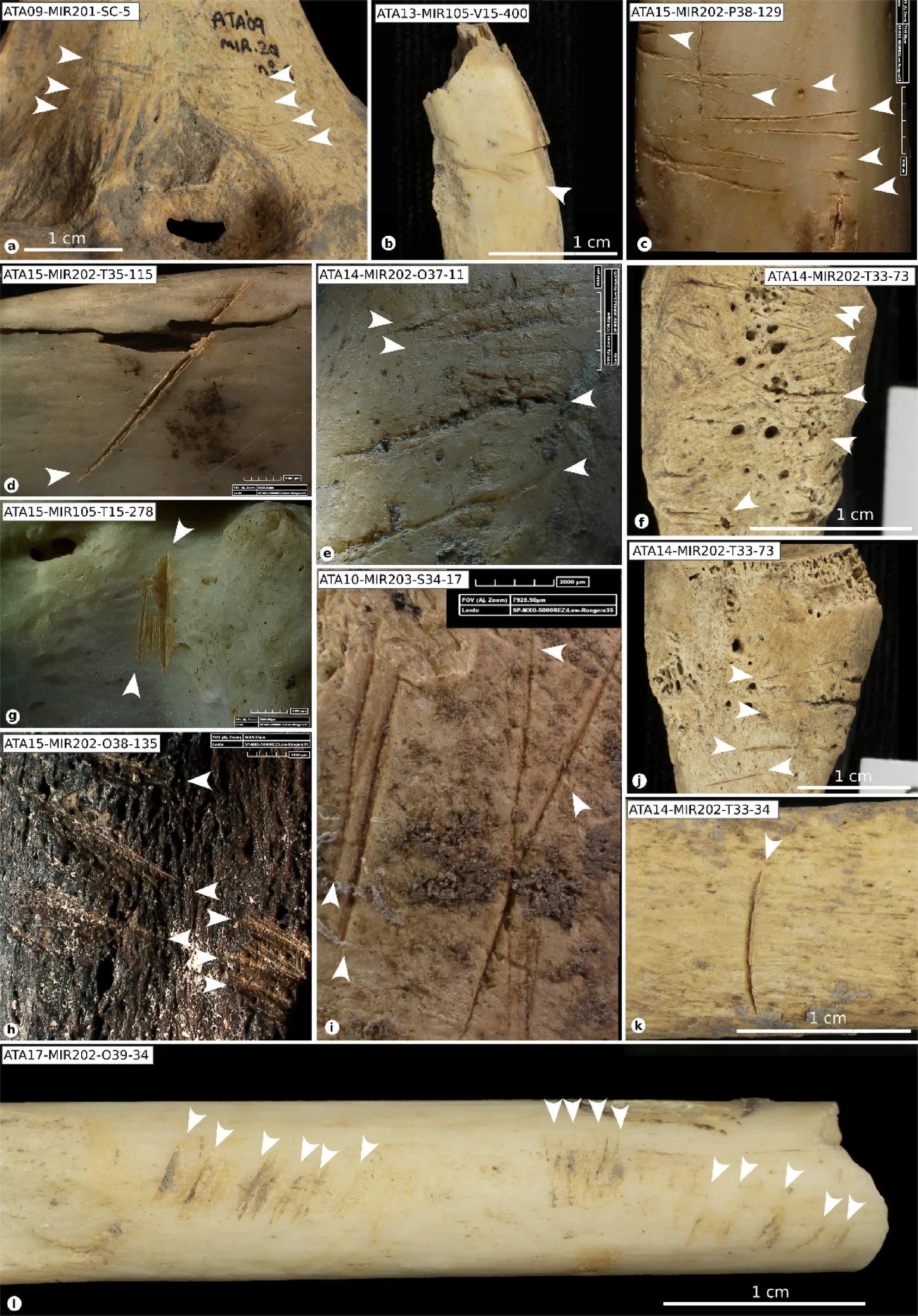 Marcas en diferentes huesos que evidencian que sus dueños fueron comidos por otros seres humanos, en la cueva burgaleza de El Mirador. Cortesía: Scientific Reports (2025). DOI: 10.1038/s41598-025-10266-w