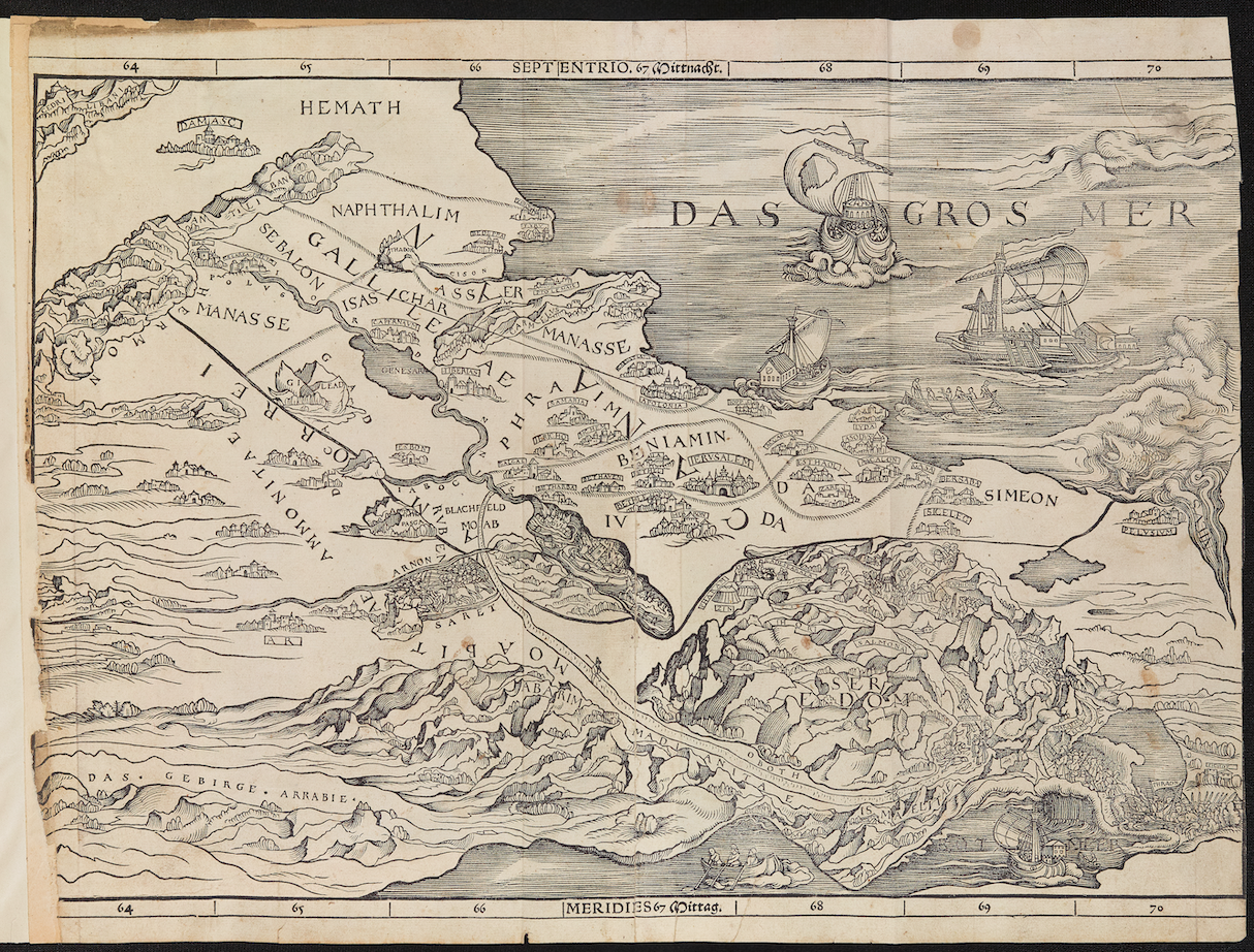 Mapa de Tierra Santa elaborado por Lucas Cranach el Viejo e incluido en el Antiguo Testamento de Christoph Froschauer (Zúrich, 1525), que se conserva en la Wren Library del Trinity College de Cambridge. Cortesía: The Master and Fellows of Trinity College, Cambridge.