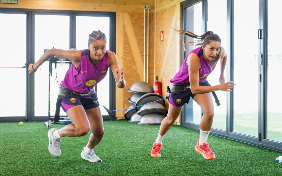 Vicky López (a la izquierda) y Clàudia Pina realizan ejercicios de velocidad y potencia con cinturones de resistencia elástica durante una sesión de entrenamiento del Barcelona. Cortesía: FC Barcelona