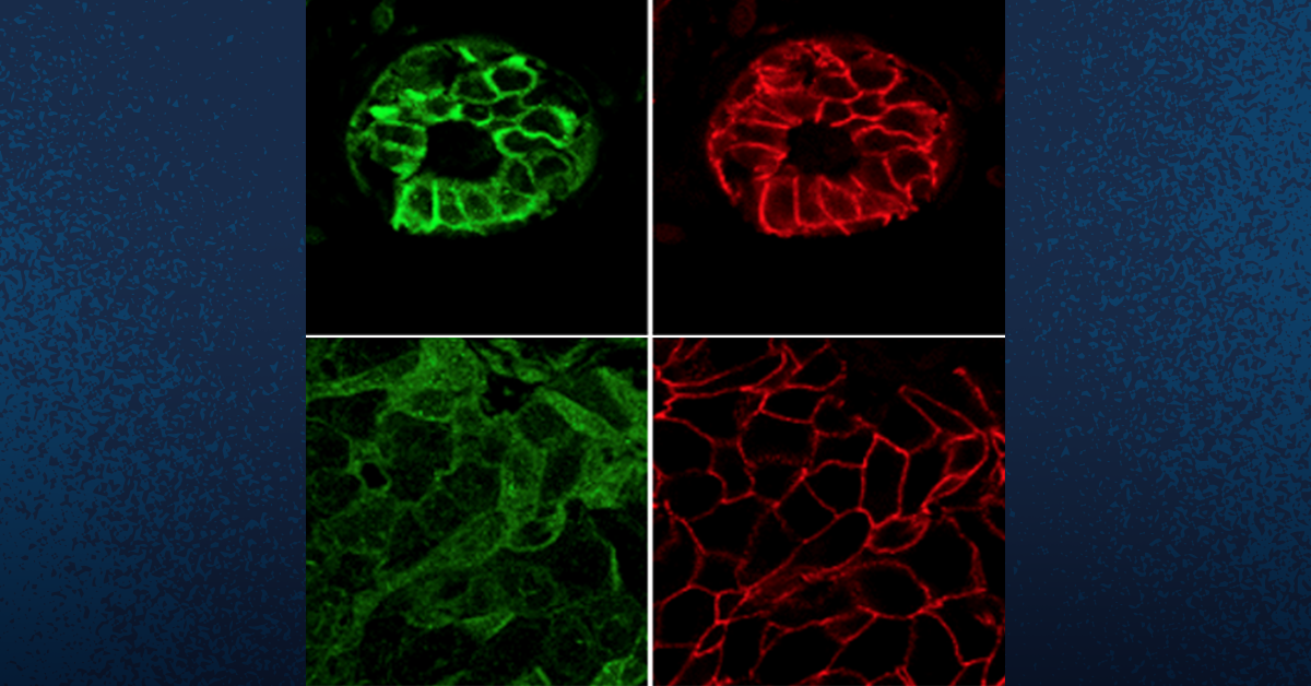 En tejidos sanos (paneles superiores), TYK2 (verde) se localiza en la membrana celular y colocaliza con E-cadherina (rojo), clave para la adhesión y la integridad del tejido. En tumores (paneles inferiores), TYK2 se dispersa dentro de la célula y pierde esa colocalización, facilitando la diseminación de las células cancerosas. Cortesía: UC San Diego Health Sciences