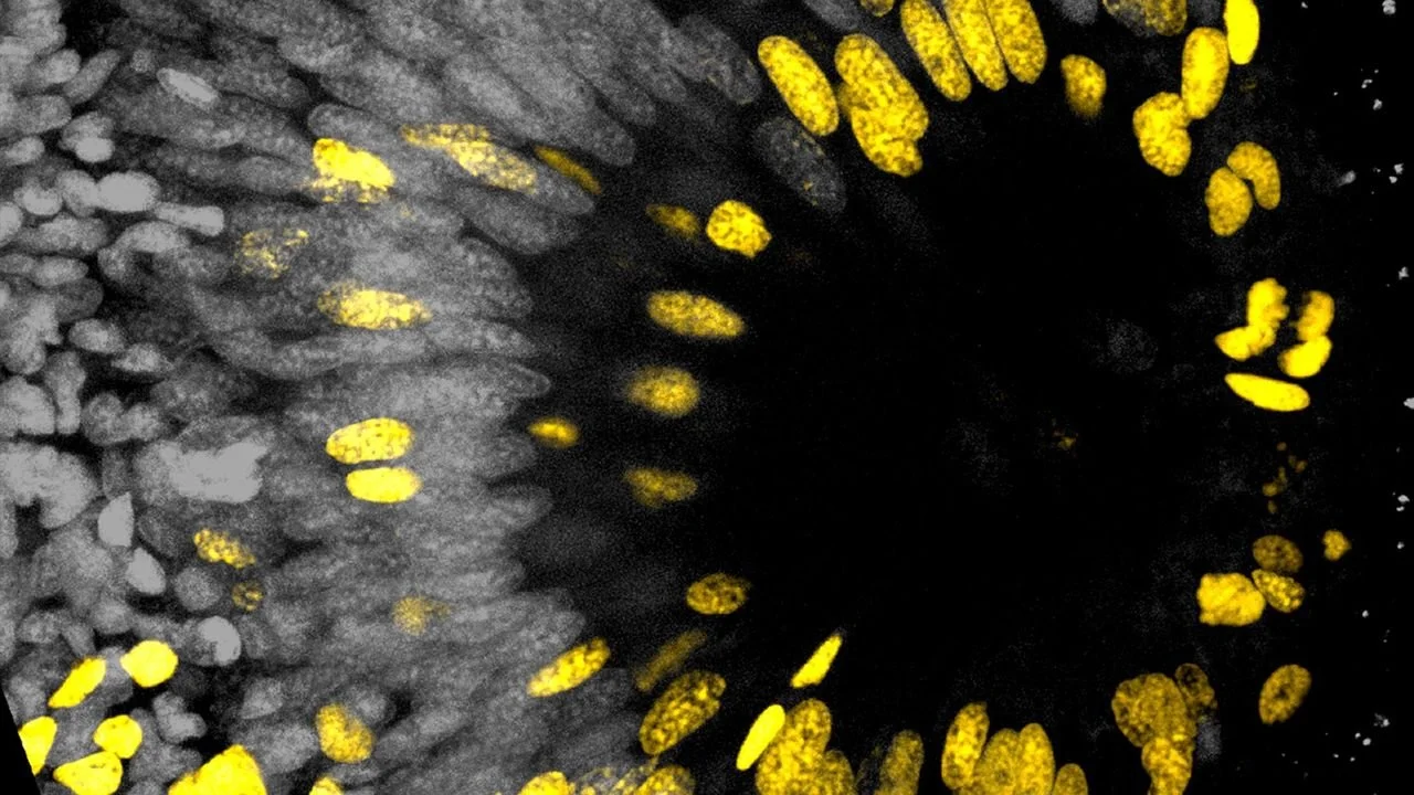 Imagen del ojo del gusano marino Platynereis dumerilii con células en división teñidas en amarillo. Cortesía: Nadja Milivojev.