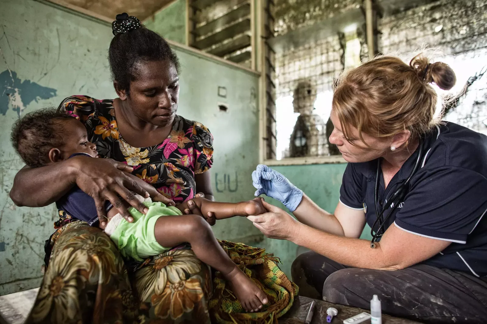 Un trabajador sanitario realiza una prueba preventiva de malaria en un centro de salud de Baimuru, Papúa Nueva Guinea. Allí la malaria sigue siendo endémica, y los modelos climáticos coinciden con la alta prevalencia de variantes inmunitarias heredadas de los denisovanos. Cortesía: YWAM