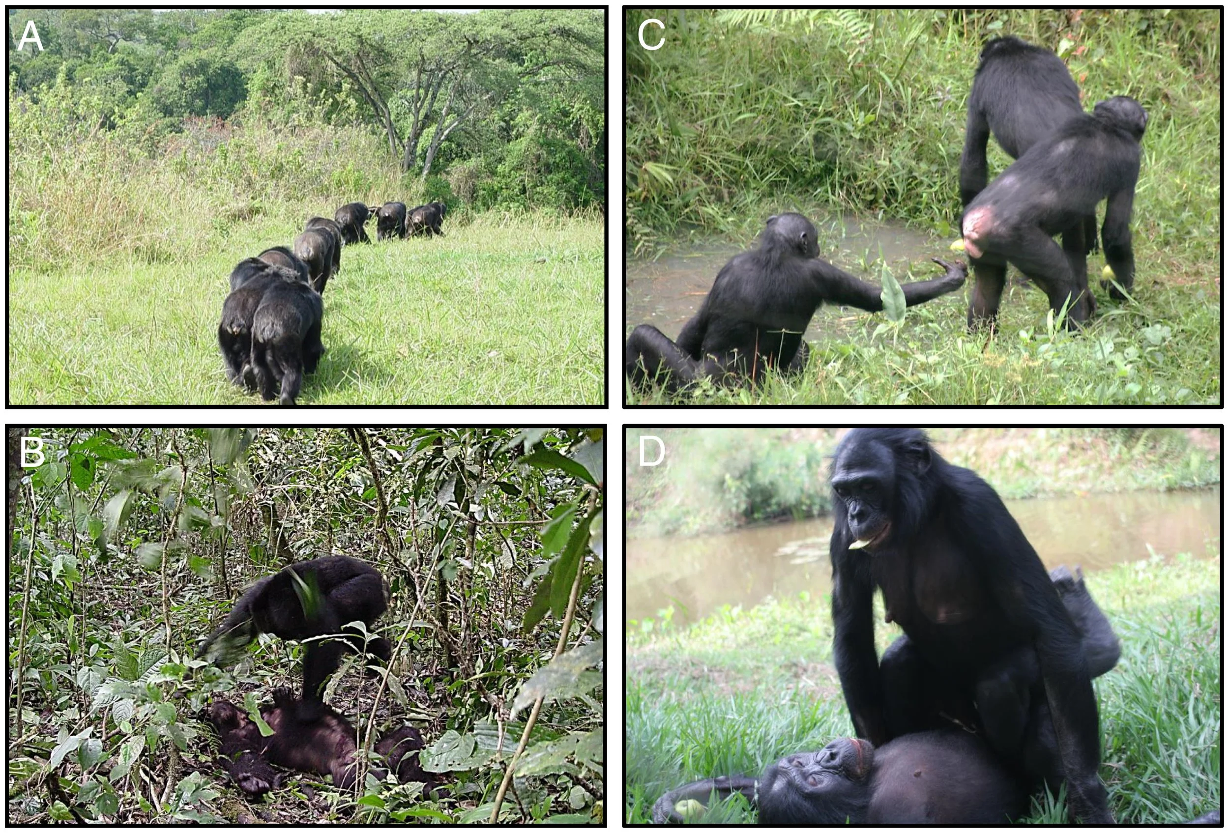 Chimpancés y bonobos muestran dos caras muy distintas de la agresión en primates. Mientras los chimpancés patrullan su territorio y pueden atacar y matar a individuos de grupos vecinos (A, B), los bonobos tienden a interactuar de forma pacífica e incluso utilizan el sexo como forma de cohesión social (C, D). Estas diferencias ilustran una de las claves del estudio: la violencia letal no es una consecuencia inevitable de la agresión cotidiana, sino un comportamiento que depende de factores sociales, ecológicos y evolutivos específicos. Cortesía: A. E. Pusey / PNAS