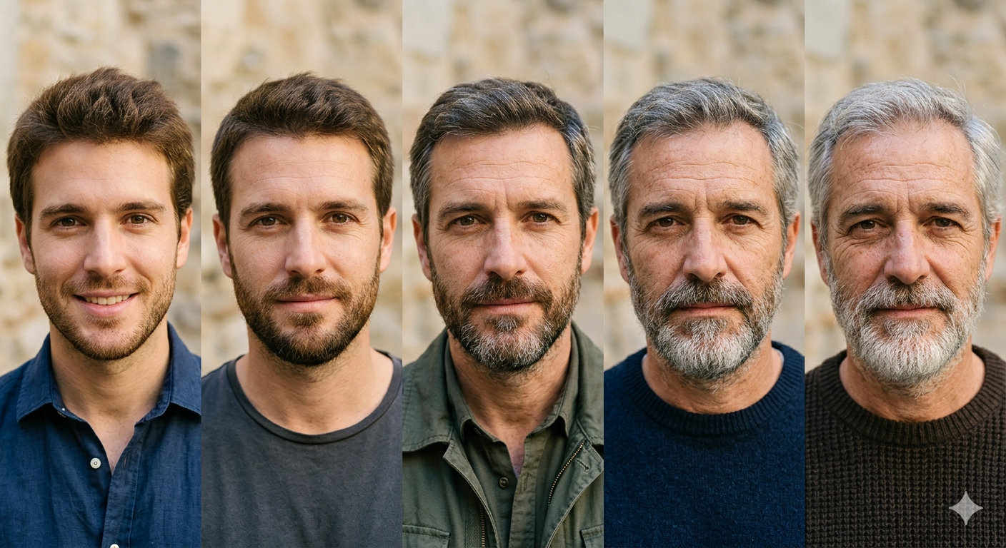 Secuencia de envejecimiento facial: la inteligencia artificial FaceAge analiza cambios en el rostro a lo largo del tiempo para estimar la edad biológica y detectar un envejecimiento acelerado, un indicador que, según el estudio, se asocia con menor supervivencia en pacientes con cáncer. Crédito: IA-Nano Banana 2-RexMolón Producciones