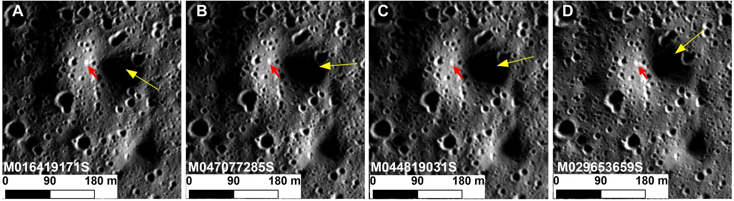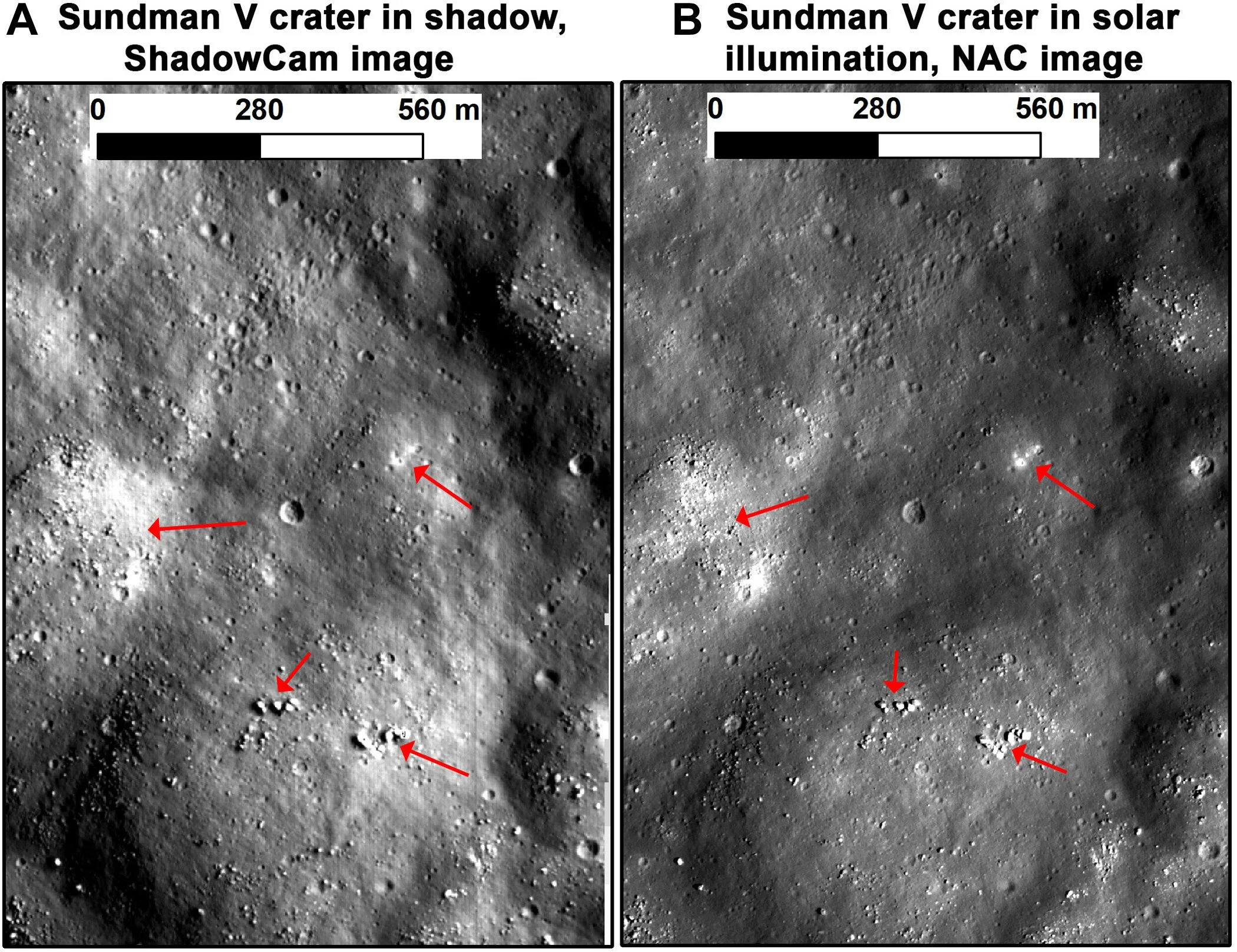 Rocas, cráteres recientes y materiales desprendidos (señalados con flechas) aparecen más brillantes que su entorno en estas imágenes del cráter Sundman V. La comparación entre zonas en sombra y con luz solar muestra que ese brillo no siempre indica presencia de hielo, sino cambios en el terreno. Cortesía: Shuai Li et al.