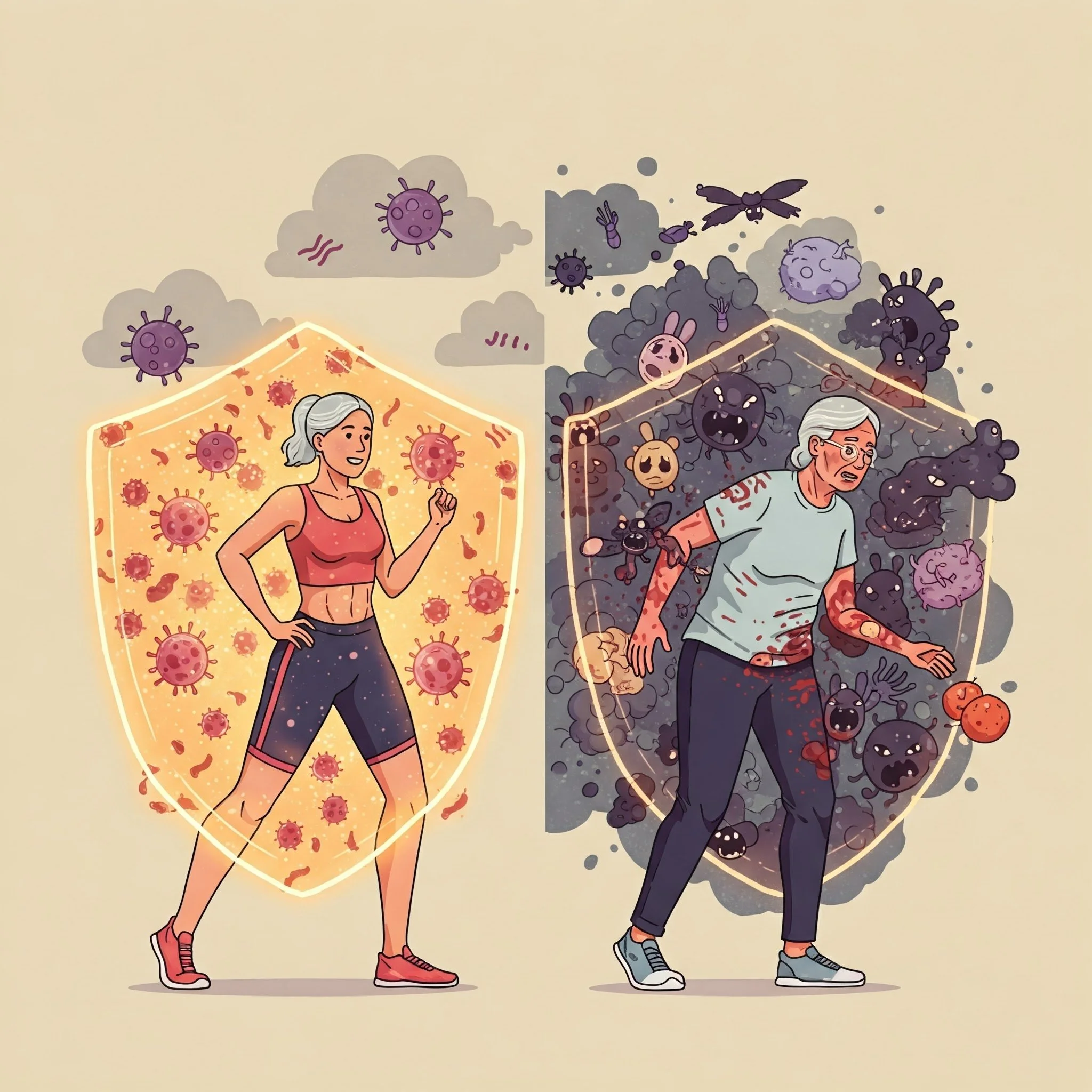 Resiliencia inmunitaria: la clave para envejecer con energía y salud. Un sistema inmune fuerte (izquierda) protege contra las enfermedades crónicas, a diferencia de un sistema debilitado (derecha). Ilustración generada con Gemini