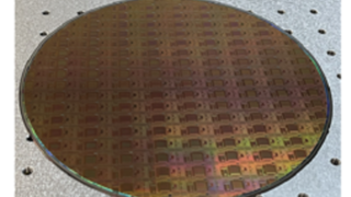 Una oblea de 300 mm con cientos de sistemas de memristor en chip totalmente integrados. Cada chip tiene diez conjuntos de barras transversales de un transistor y un memristor de 256 × 256 y circuitos periféricos en el chip. Foto cortesía de TetraMem Inc.