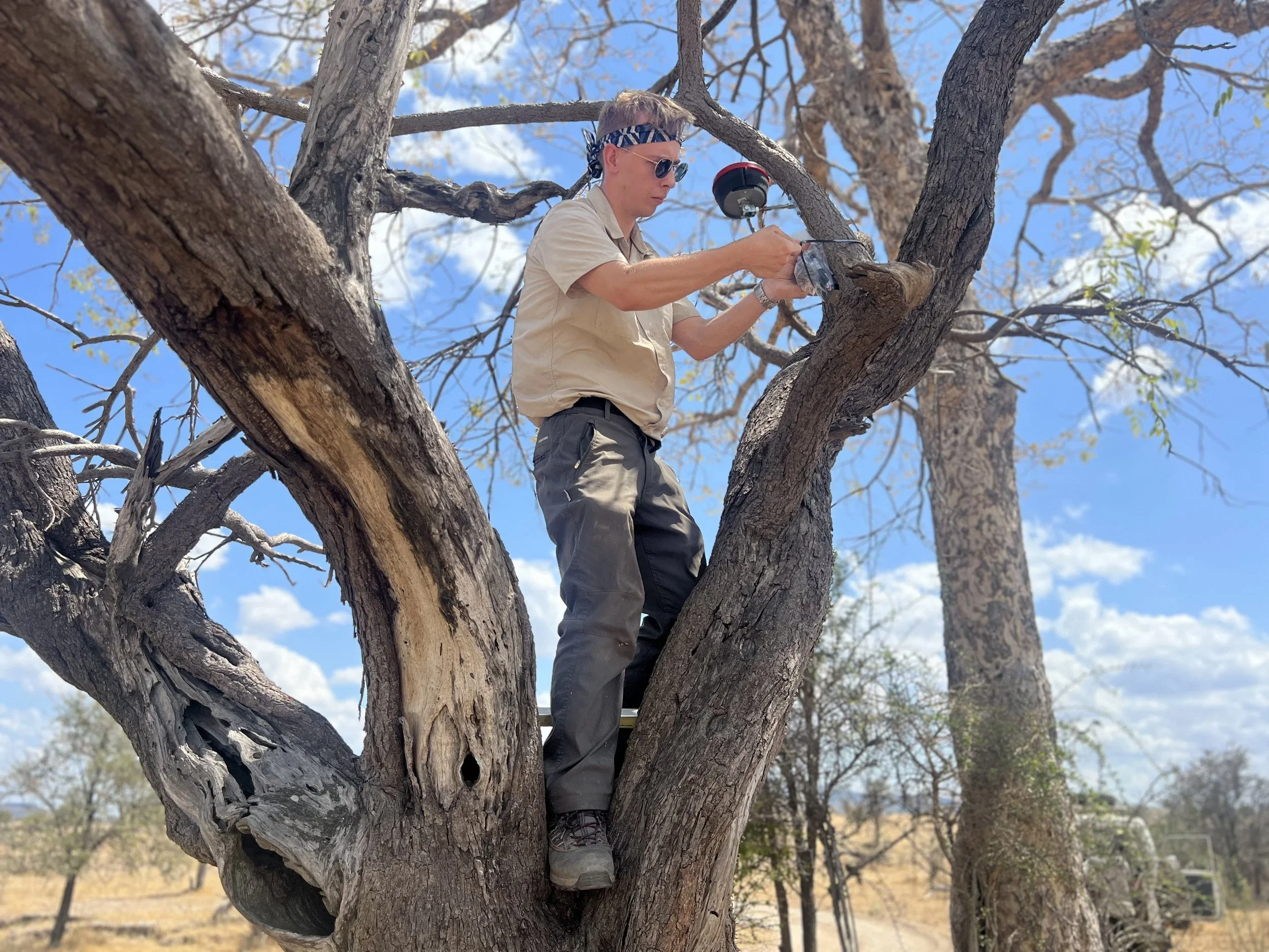Jonathan Growcott coloca en un árbol sistema de audio para registrar el rugido de los leones. Cortesía: Jonathan Growcott