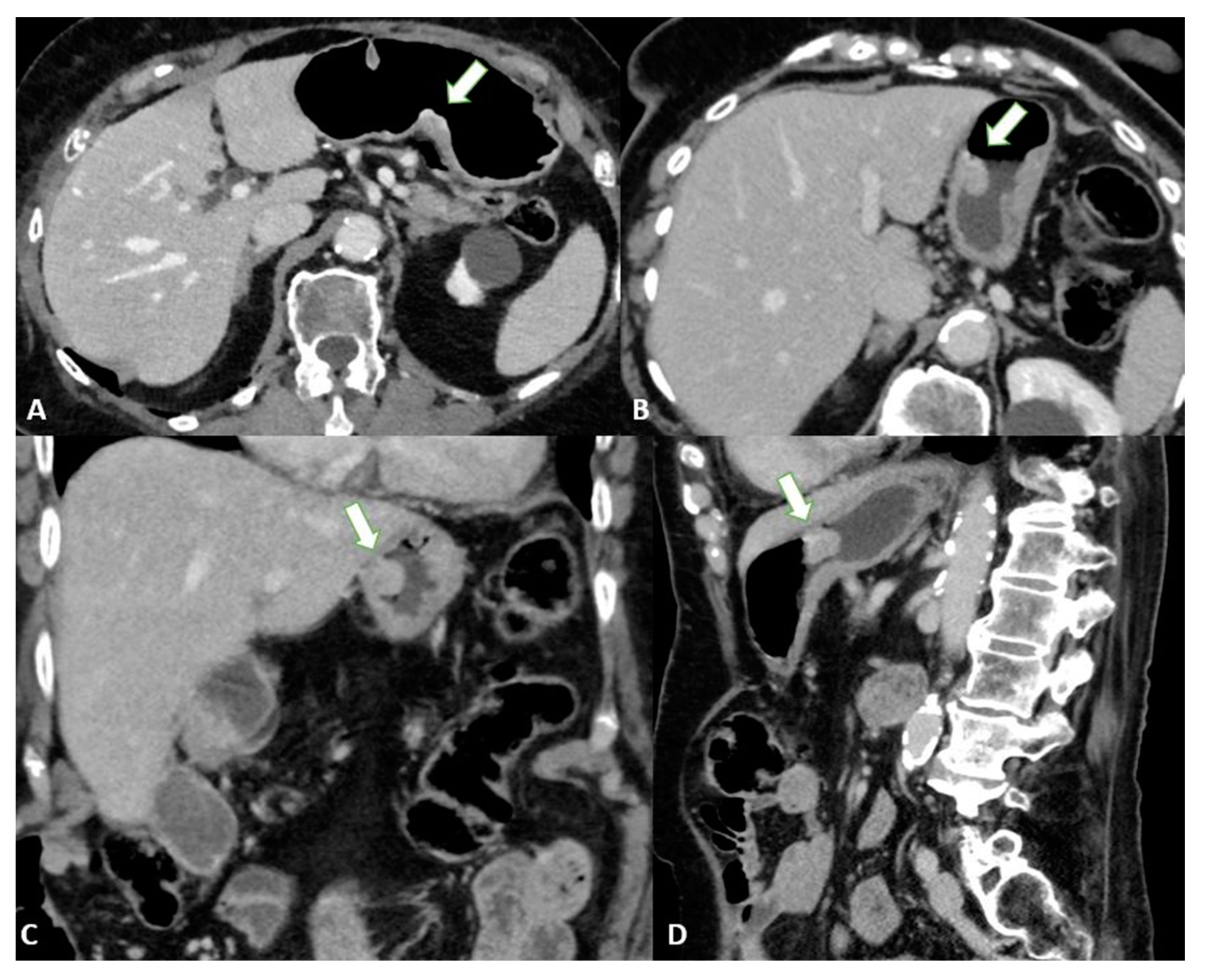 Escáner de un cáncer gástrico de una paciente de 67 años de edad. Los investigadores han descubierto que los pacientes con este tumor presentan en sus intestinos una sobreabundancia de bacterias pertenecientes a las familias Firmicutes, Bacteroidetes y Actinobacteria. Cortesía: Cesare Maino et al.