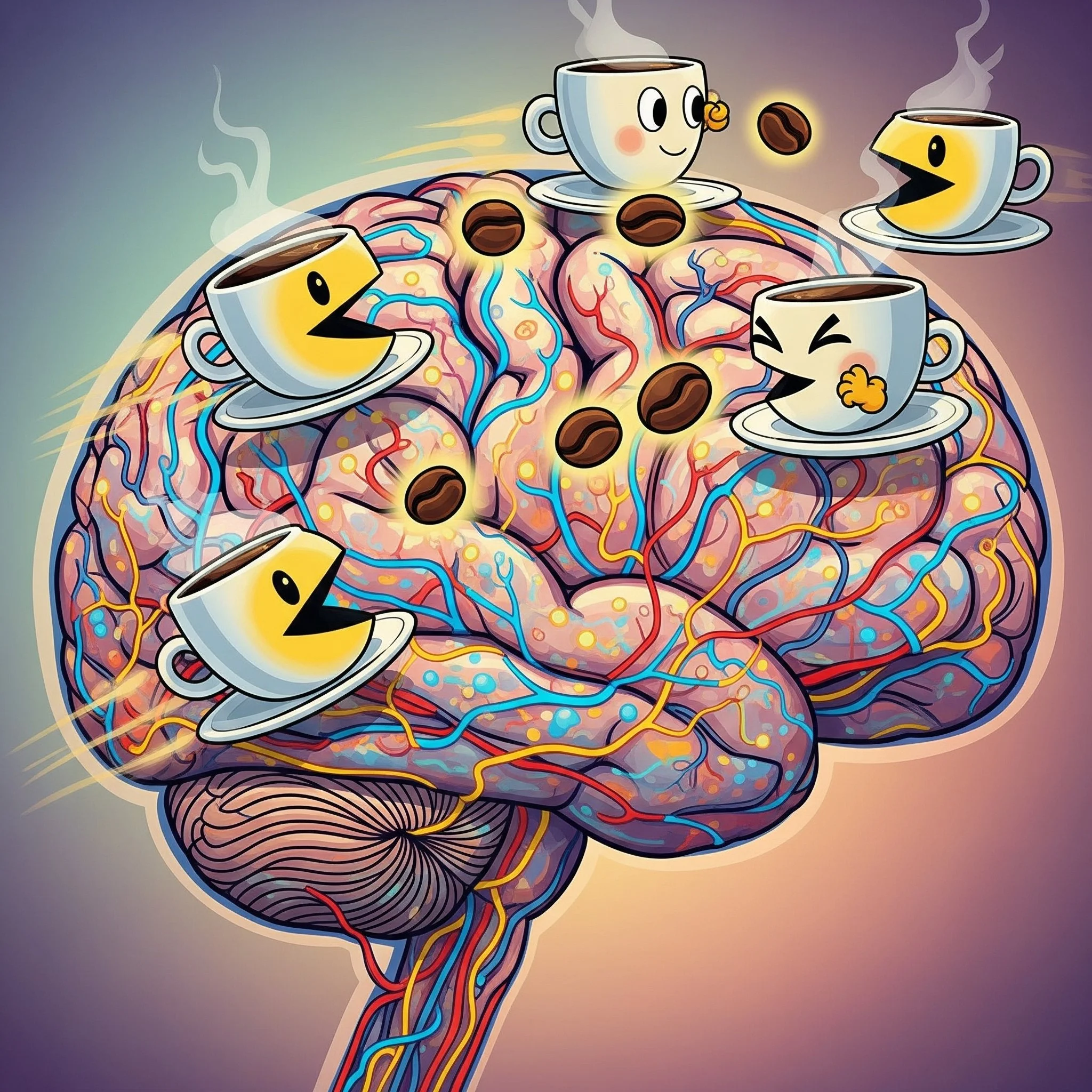 Ilustración conceptual del impacto de la cafeína en el cerebro durante el sueño: las tazas de café, como si fueran personajes de los videojuegos clásicos, recorren un cerebro activado, simbolizando así cómo la cafeína aumenta la complejidad y la actividad neuronal incluso durante el descanso. Imagen generada con Gemini