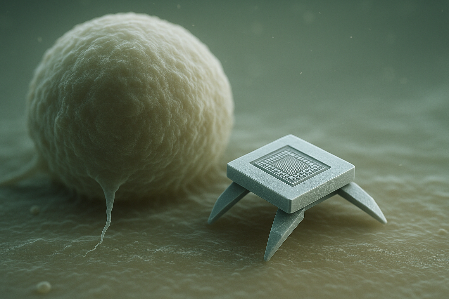 Un microrrobot de silicio, a la derecha, junto a una célula biológica, observado a escala microscópica. Estos robots, del tamaño de un organismo unicelular, integran sensores, memoria, computación digital y sistemas de movimiento autónomo, lo que les permite percibir su entorno, tomar decisiones y modificar su comportamiento sin control externo, según describe el estudio publicado en Science Robotics. Crédito: IA-DALL-E-RexMolón-Producciones